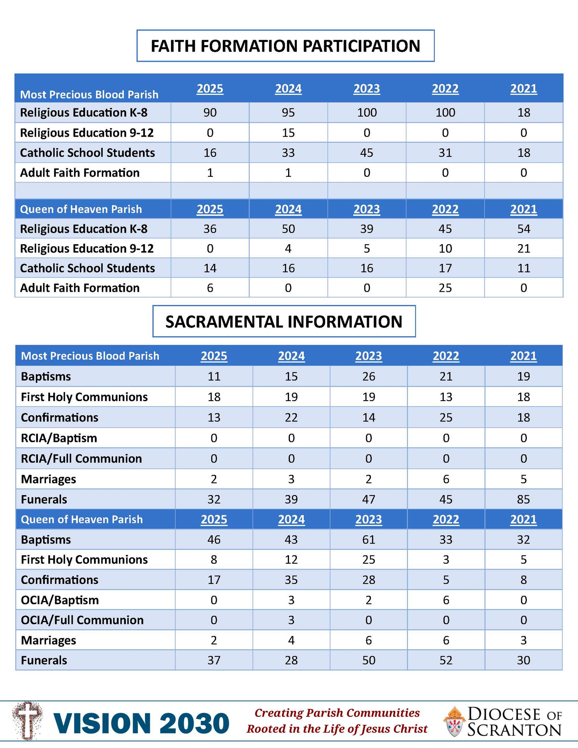 For more than six years, Most Precious Blood and Queen of Heaven Parishes have been working together in a linkage with a single Pastor. Because both parishes have remained independent throughout this linkage, they each have their own Finance Council, and the administrative and financial work can often be redundant. Because both parishes are already accustomed to sharing a Pastor, a consolidation of Most Precious Blood and Queen of Heaven Parishes occured on July 1, 2025. A consolidation of two (or more) parishes combines the resources of the existing parishes and actively creates a new, combined parish. This move allows for streamlined administrative and financial work.